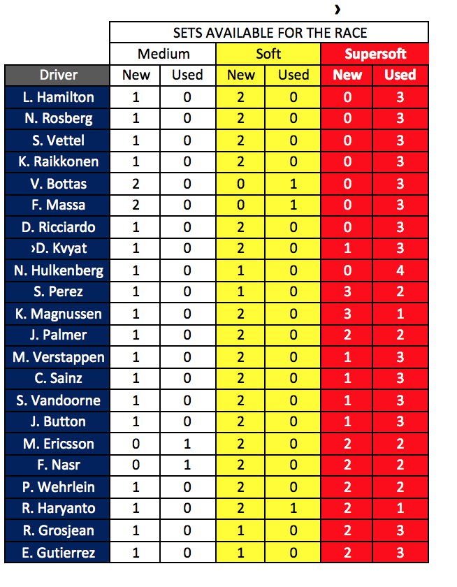 Jaunie noteikumi, kas atļauj braucējiem izmantot trīs dažādas cietības riepas ļauj izvērsties stratēģijas izvēlē. No punktos finišējušajiem braucējiem tikai Rosbergam ar Raikonenu bija vienāda riepu stratēģija, kamēr Luiss Hamiltons otro nogriezni veica ar vidējas cietības riepām, kas negaidīti esot dilušas tikpat ātri kā mīkstās riepas. Tieši ilgāks brauciens pēc pirmā pitstopa bija veids, kā “Mercedes” komanda esot centusies izcīnīt dubultuzvaru.