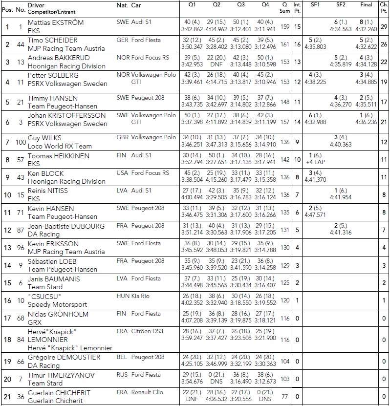 Andreass Bakerūds izcīnīja uzvaru Q4, bet aiz viņa palika abi “PSRX Volkswagen Sweden” komandas braucēji Peters Solbergs un Johans Kristofersons. Tikmēr četru kvalifikāciju kopvērtējumā labākais bija Timo Šeiders.