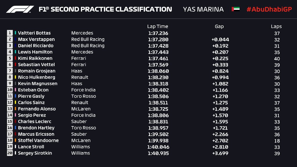 Aiz Botasa sekoja abi “Red Bull” braucēji Makss Verstapens un Daniels Rikardo, kuri ātrākajam laikam zaudēja attiecīgi 0,044 un 0,192 sekundes. Ceturtais palika Botasa komandas biedrs Luiss Hamiltons, bet atlikušās divas vietas pirmajā sešiniekā ieņēma “Ferrari” piloti Kimi Raikonens un Sebastians Fetels.