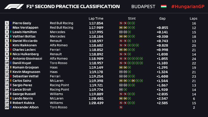 Pjērs Gaslī uzrādīja laiku 1m17.854s, bet Verstapens no sava komandas biedra atpalika vien pāris sekundes simtdaļas. Hamiltons ātrākajam laikam zaudēja 0,141 sekundi, bet otrs “Mercedes” pilots Valteri Botass palika ceturtais, no francūža atpaliekot par 0,330 sekundēm. Piektajā un sestajā vietā ierindojās attiecīgi Daniels Rikardo (“Renault”) un Kimi Raikonens (“Alfa Romeo”).