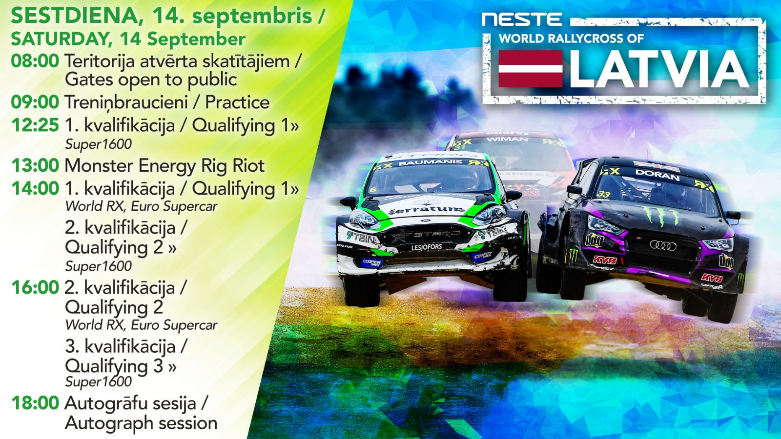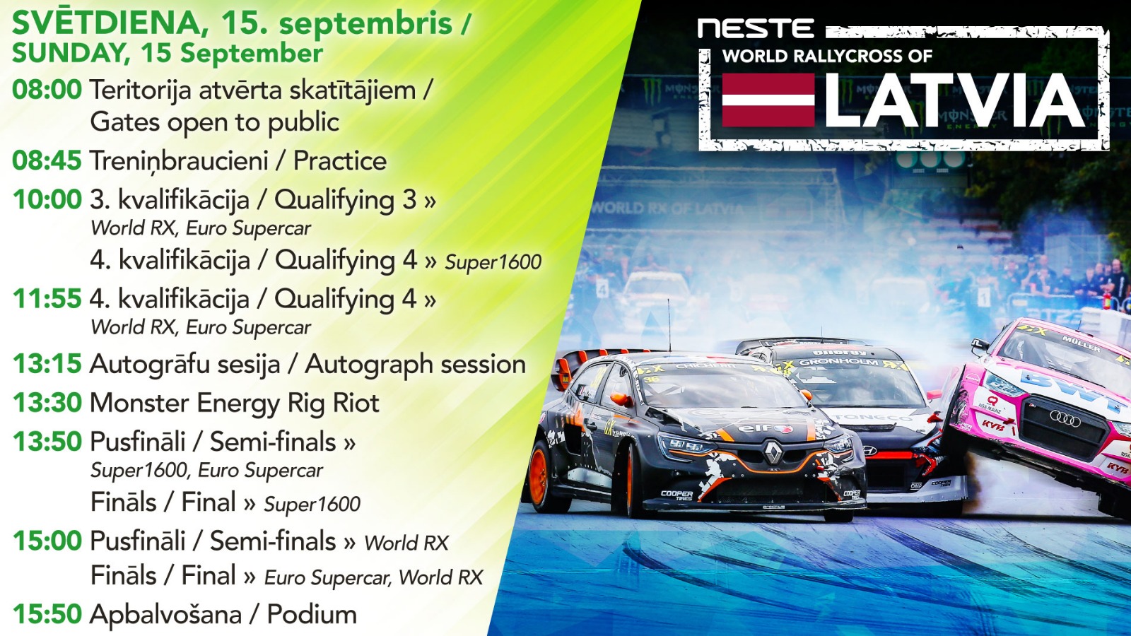 Nemainīgi, otro gadu pēc kārtas FIA pasaules rallijkrosa čempionāta norises būs skatāmas Latvijas Televīzijas kanālā LTV7. Arī šogad no Neste World RX of Latvia paredzēts translēt paplašinātu programmu, kas ietvers visu kvalifikācijas kārtu braucienu tiešraides, ko visas dienas garumā papildinās arī rallijkrosa studija.