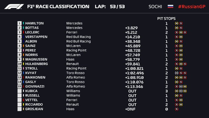 Atlikušo sacīkstes daļu Hamiltons pavadīja pārliecinošā sacīkstes vadībā, bet Leklerks, neraugoties uz mēģinājumiem apdzīt Botasu DRS zonā, netika garām, pirmajam trijniekam finišējot šādā pat secībā.
