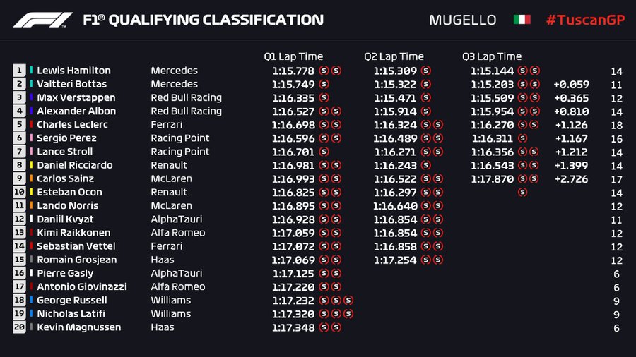 Pēdējās 12 minūtēs līderiem labākie laiki tika uzstādīti jau ar pirmo mēģinājumu. Hamiltonam izdevās Mudžello trases apli veikt ar laiku 1:15.144s, kamēr Botass no viņa atpalika par 0,059 sekundēm. Otrajā starta rindā rīt stāsies “Red Bull” komandas braucēji Makss Verstapens un Alekss Albons, kuri pārliecinoši ieņēma trešo un ceturto vietu, Hamiltonam zaudējot attiecīgi 0,365 un 0,810 sekundes.