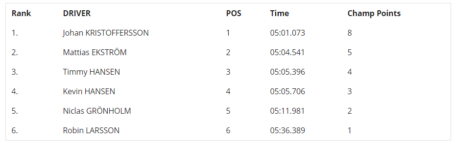 Finālā startā kārtējās sadursmes, no kurām visveiksmīgāk izsprukt padevās tieši Kristofersonam, savu pozīciju noturot līdz rūtotajam karogam. Turpinājumā otrais aizbrauca Timijs Hansens, tomēr sešu apļu garajā sacīkstē Ekstromam izdevās apsteigt tautieti. Aiz pjedestāla palika Timija Hansena brālis Kevins, vienīgais ne zviedru sportists šajā braucienā – Gronholms, kā arī Larsons.