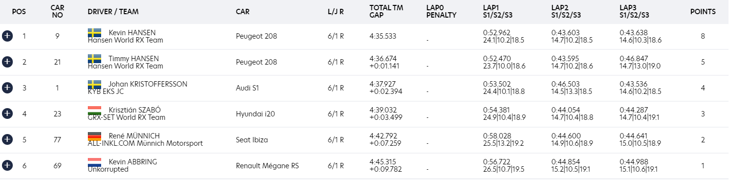 Jau pirmajā kvalifikācijas kārtā piektdienas pievakarē ātrāko laiku uzrādīja Johans Kristofersons, kurš brauciena laikā spēja trasē apdzīt Timiju Hansenu. Tomēr vēlāk izrādījās, ka viņa ‘datu ierakstīšanas iekārta’ neesot bijusi korekti pievienota, kā rezultātā sekoja rezultātu anulēšana. Tā rezultātā pirmās divas vietas ieguva abi brāļi Timijs un Kevins Hanseni, savukārt trešais ātrākais pilots bija ar “Seat Ibiza” auto braucošais DTM čempions Timo Šeiders.