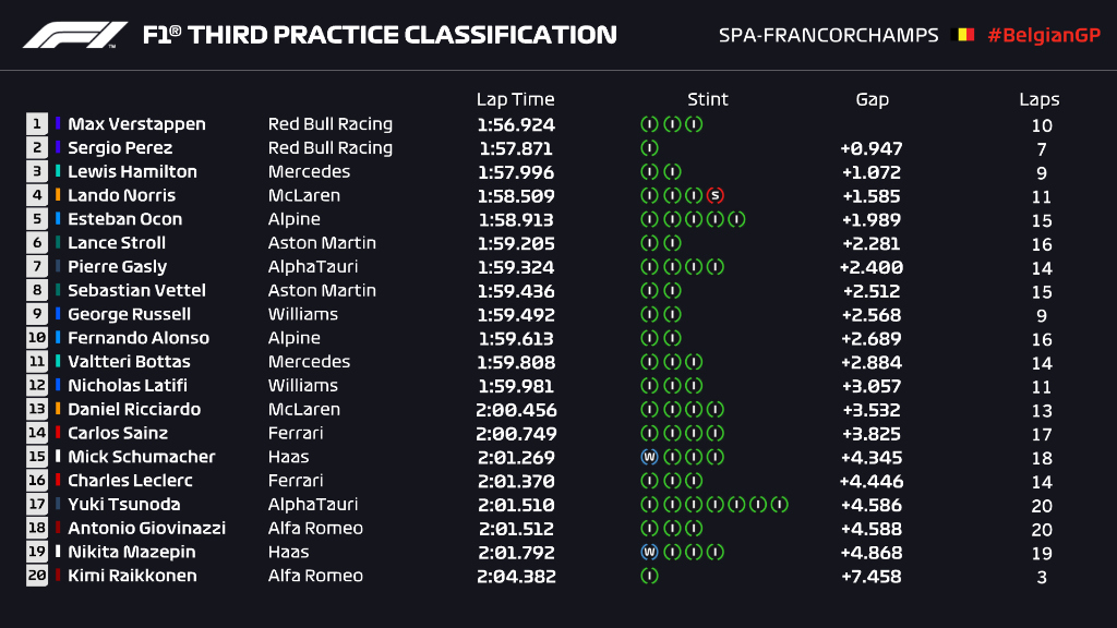 Spa trasē aizvadīts Beļģijas Grand Prix trešais treniņbrauciens, kurā ātrāko apli uzrādīt spēja “Red Bull” komandas braucējs Makss Verstapens.