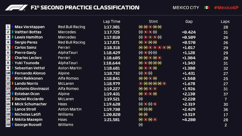 “Red Bull” braucējs Verstapens savu labāko apli Mehiko trasē veica ar laiku 1:17.301, bet nīderlandieša galvenais kopvērtējuma konkurents Hamiltons palika 3. vietā, zaudējot 0,509 sekundes. Abiem pa vidu iespraucās otrs “Mercedes” pilots Valteri Botass (+0,424s), savukārt ceturtais laiks, vien pāris simtdaļas aiz Hamiltona, Serhio Peresam. Piektajā un sestajā vietā attiecīgi Karloss Saincs un Pjērs Gazlī.