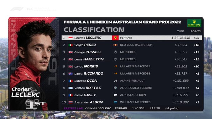 Ar “Ferrari” pilota Šarla Leklēra uzvaru Melburnā noslēdzies Formula 1 sezonas trešais posms Austrālijas Grand Prix izcīņa. Atlikušājās pjedestāla pozīcijās finišēja Serhio Peress un Džordžs Rasels, kamēr Makss Verstapens izstājās ar dzinēja problēmām.