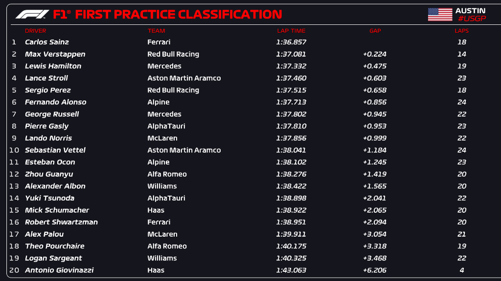 Saincs pirmajā treniņā bija vienīgais savas komandas pamatsastāva braucējs trasē, jo “Ferrari” šoreiz deva iespēju pie Formula 1 bolīda stūres sēsties jaunajam pilotam Robertam Švarcmanam. Līdzīgi rīkojās vēl vairākas vienības – “McLaren” komandā Danielu Rikardo nomainīja Indycar pilots Alekss Palou, “Alfa Romeo” sastāvā Valteri Botasa vietā trasē devās Teo Puršērs, “Williams” Nikolā Latifi tika aizstāts ar Loganu Seržantu, bet “Haas” iespēju deva Antonio Džiovinaci.