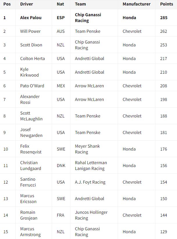 Pēc panākuma “Laguna Seca” trasē Herta ir atguvis vadību kopvērtējumā, kur tagad tuvākais sekotājs Vils Pauvers zaudē 23 punktus. Šoreiz “Team Penske” braucējs bija vien septītais, kamēr sestais finišu sasniedza Palou komandas biedrs Skots Diksons – veterāns pašlaik trešais kopvērtējumā, jau 32 punktus aiz līdera. Herta pēc izcīnītās otrās vietas ir ceturtais kopvērtējumā.