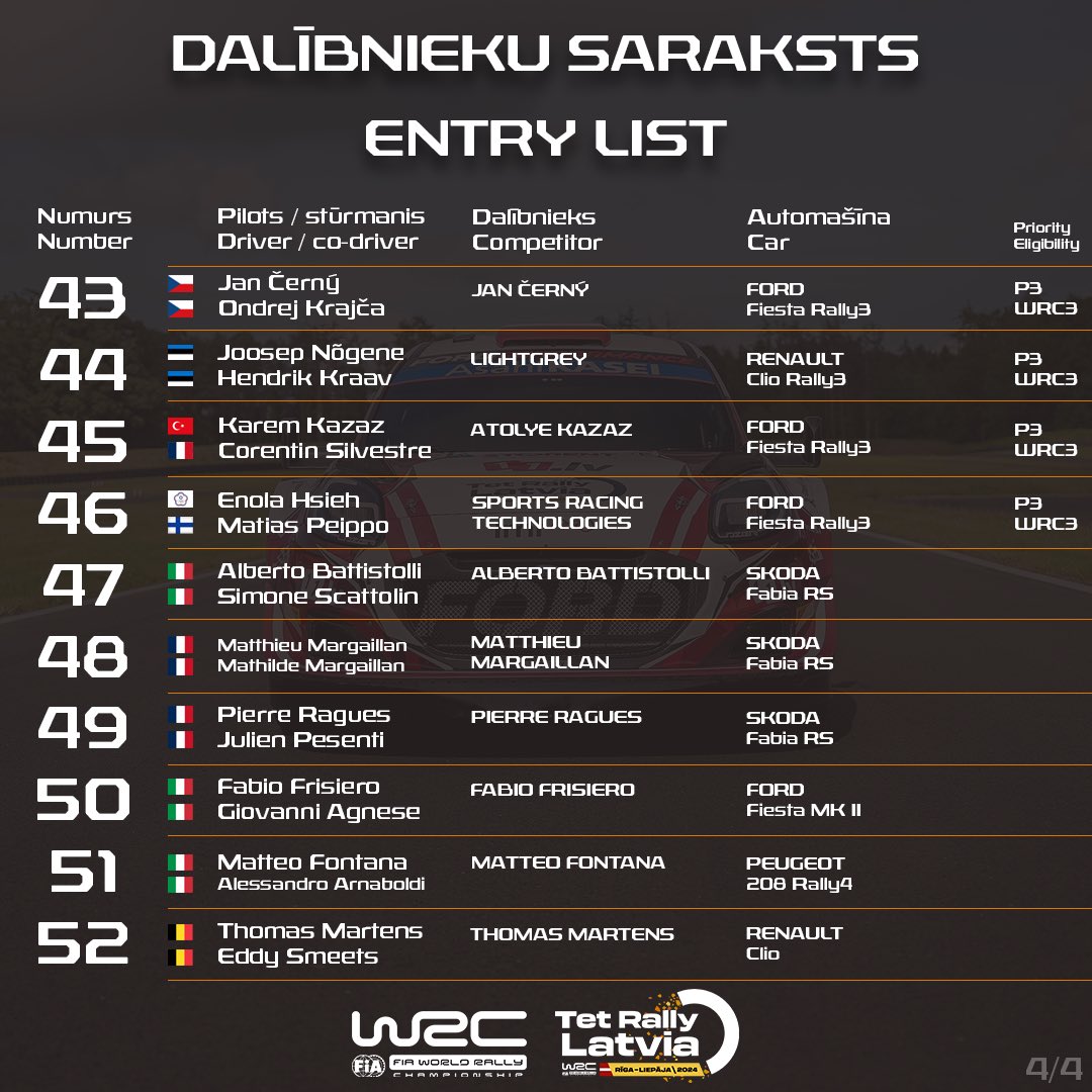 Dalību FIA pasaules rallija čempionāta (WRC) Latvijas posmā Tet Rally Latvia pieteikušas 40 ekipāžas, tostarp visas aktīvo pasaules čempionu – Sebastjēna Ožjē, Kalles Rovanperas un Ota Tanaka ekipāžas. Kopumā desmit ekipāžas startēs ar pilnvērtīgām Rally1 HYBRID automašīnām, tai skaitā, pašmāju skatītāju klātbūtnē, arī liepājnieki Mārtiņš Sesks / Renārs Francis. Vēl 24 ekipāžas, ar Oliveru Solbergu priekšgalā, startēs ar Latvijā ilggadīgi notikušā FIA Eiropas rallija čempionāta posma norises laikā labi iepazītajām Rally2 automašīnām – ar kādām Tet Rally Latvia redzēsim vēl divu latviešu pilotu – Matīsa Mežaka un Artura Priednieka ekipāžas.