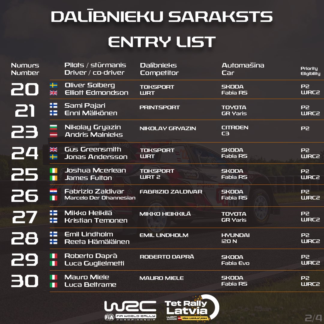 Aizraujošu spēkošanos par Tet Rally Latvia uzvaru paredz arī WRC2 ieskaites dalībnieku sastāvs, kur viens no līderiem noteikti būs Olivers Solbergs, kurš līdzīgi kā Rovanpera, savu karjeru aizsāka tieši Latvijā – no priekšpiedziņas automašīnām izaugot līdz pat augstākajam WRC līmenim. Starp Solberga galvenajiem konkurentiem var minēt somu Sami Pajari, kuram drīzumā paredzēta debija pie Rally1 automašīnas stūres, un iepriekš ar Rally1 startējušais pilots Gass Grīnsmits.