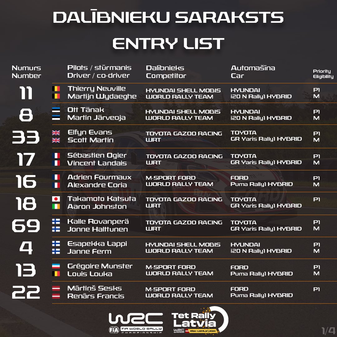 “Desmit Rally1 automašīnas, starp kurām būs redzami visu trīs aktīvo pasaules čempionu un liepājnieka Mārtiņa Seska ekipāža. Nezinu vai mūsu debijas sacensībām varētu iedomāties vēl labāku scenāriju,” iesāk Tet Rally Latvia direktors Raimonds Strokšs. “Šīm desmit pievienosies ļoti plašs loks prasmīgu Rally2 ekipāžu, kuras skatītājiem ļaus pilnvērtīgi izbaudīt pasaules rallija čempionāta burvību. Gan Biķernieku trasē, gan Tukuma, Talsu, Kuldīgas un Dienvidkurzemes novados, gan rallija pilsētā Liepājā rallija skatītāji varēs novērtēt jaudīgāko pasaules līmeņa tehniku ar pasaules ātrākajiem rallija pilotiem pie stūres. Un līdzās pasaules vadošajām rallija ekipāžām – arī trīs Latviešu pilotu ekipāžu!” tā Raimonds Strokšs.
