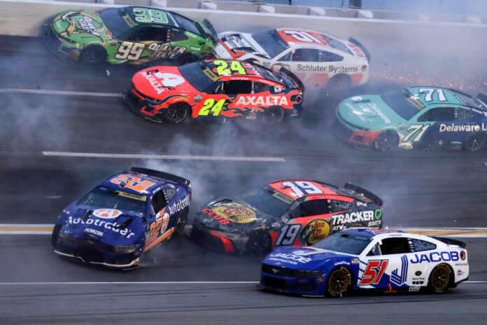 Milzīga avārija svētdienas rītā notika NASCAR “Cup Series” posmā Atlantā, kad pēc Denija Hamlina un Džona-Hantera Nemečeka kontakta sākās masveida sadursme. Tajā bija iesaistītas aptuveni 20 mašīnas – aptuveni puse no visiem dalībniekiem. Pēc notikušā sacensības nācās uz laiku apturēt, bet deviņi braucēji cīņu turpināt nevarēja.