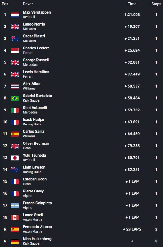 Līdz septītajai vietai aizcīnījās “Williams” pilots Alekss Albons, astotais finišu šķērsoja Andrea Kimi Antonelli, tomēr pēc piecu sekunžu soda saņemšanas atkrita uz devīto pozīciju. “Mercedes” jaunais talants bija piespiedis Albonu savstarpējā cīņā izbraukt no trases. Astotais līdz ar to “Sauber” braucējs Bortoleto, bet, startējot no boksiem, pie pēdējā punkta tika Īzaks Hadžārs no “Racing Bulls” komandas.