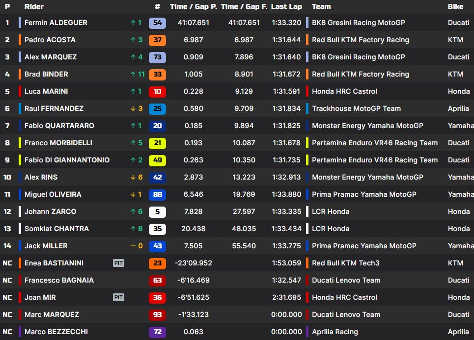 Alekss Markss pamazām bija ieguvis pozīcijas un dažus apļus pirms finiša pamanījās nonākt jau otrajā vietā, bet Akosta pozīciju atkaroja un noturēja to līdz finišam. Aldeguers, kura līdz šim augstākie sasniegumi pirmajā “MotoGP” sezonā bija trešā vieta Francijas un otrā vieta Austrijas posmā, finišēja ar graujošu pārsvaru pār Akostu un A.Markesu, kurš savukārt kļuvis par privāto komandu braucēju titula ieguvēju. Ceturtais beigās bija Breds Binders, bet Marīni ieņēma piekto vietu un Fernandess – sesto. Rinsam noslēdzošie apļi neizvērsās veiksmīgi, un viņš palika tikai desmitais.