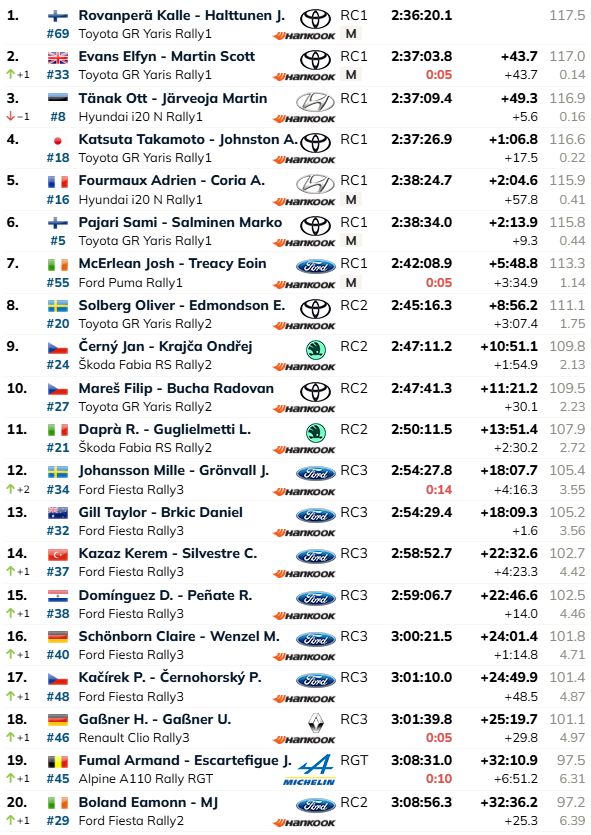 Ožjē un Rovanperas cīņa par vadību noslēdzās ar Ožjē izstāšanos, kad pēc pārsistas riepas mašīna ieslīdēja kokā. Tas ļāva Rovanperam mierīgi kontrolēt tempu un svinēt pārliecinošu uzvaru ar 43,7 sekunžu pārsvaru.