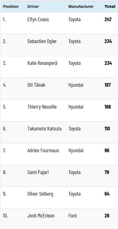 Elfins Evans finišēja otrais, pēdējā ātrumposmā apsteidzot Otu Tanaku un atgūstot vadību čempionāta kopvērtējumā pēc tam, kad Sebastjēns Ožjē sestdien izstājās avārijas dēļ. Lai gan francūzis svētdien uzvarēja gan “Super Sunday” vērtējumā, gan “Power Stage” ātrumposmā, viņš tagad kopvērtējumā atpaliek no Evansa par 13 punktiem – tikpat, cik Rovanpera. “Toyota” līdz šim nebija uzvarējusi Centrāleiropas rallijā, taču šoreiz “GR Yaris Rally1” mašīnas dominēja visu nedēļas nogali.