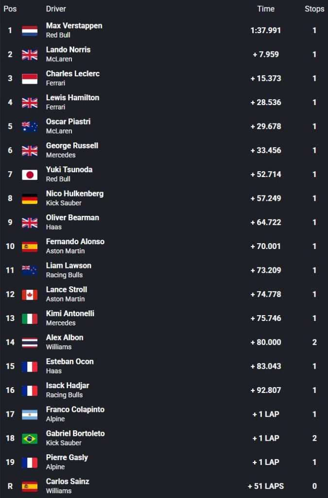 Turpmākajā sacīkstes daļā Verstapens pārliecinoši kontrolēja situāciju un finišēja pirmais, kamēr Noriss sacīkstes beigu daļā vēlreiz apdzina Leklēru un nodrošināja otro vietu. Leklērs finišēja trešais, aiz viņiem ceturtais bija Luiss Hamiltons, bet piektais – čempionāta līderis Oskars Piastri, kuram šī bija salīdzinoši viduvēja nedēļas nogale. Džordžs Rasels finišēja sestais, Juki Cunoda noturēja septīto vietu, kamēr Olivers Bērmens pēc sagriešanās zaudēja pozīciju Nikam Hilkenbergam. Pēdējo punktu izcīnīja Fernando Alonso.