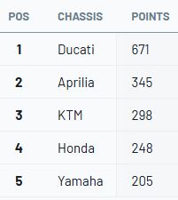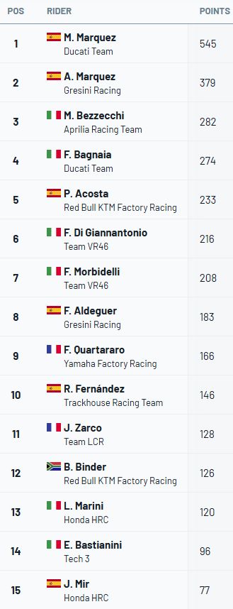 Pagājušās nedēļas nogalē Austrālijā “Aprilia” dominēja visu nedēļas nogali. “Trackhouse” komandas pārstāvis Rauls Fernandess izcīnīja savu pirmo uzvaru, bet rūpnīcas braucējs Marko Bedzeki finišēja trešais, neskatoties uz diviem long lap sodiem. Arī Indonēzijā “Aprilia” noteica tempu, izcīnot dubultuzvaru sprinta sacīkstē.