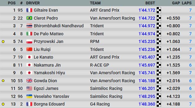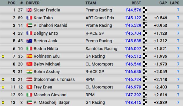 Sesijas izskaņā ar labāko laiku 1:46.724 latviešu pilots ierindojās desmitajā vietā starp 13 braucējiem un otrajā – starp debitantiem. Uzvaru ar apli 1:44.576 guva sezonas līderis Fredijs Sleiters no “Prema Racing”, kuram mūsu sportists piekāpās par 2.148 sekundēm. RPM pilots Džovanni Maskio, kurš aizvada pilnu sezonu, bija lēnāks par komandas biedru Štolcermani, paliekot 12. pozīcijā.