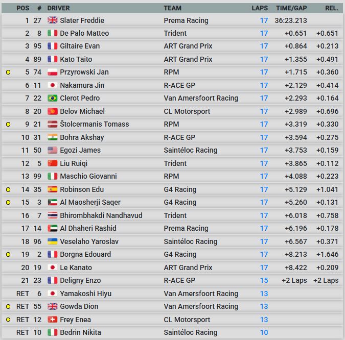 Uzvaru izcīnīja šīs sezonas čempions Fredijs Sleiters (“Prema Racing”), kurš aiz sevis atstāja Mateo De Palo (“Trident”) un Evanu Žiltēru (“ART Grand Prix”).