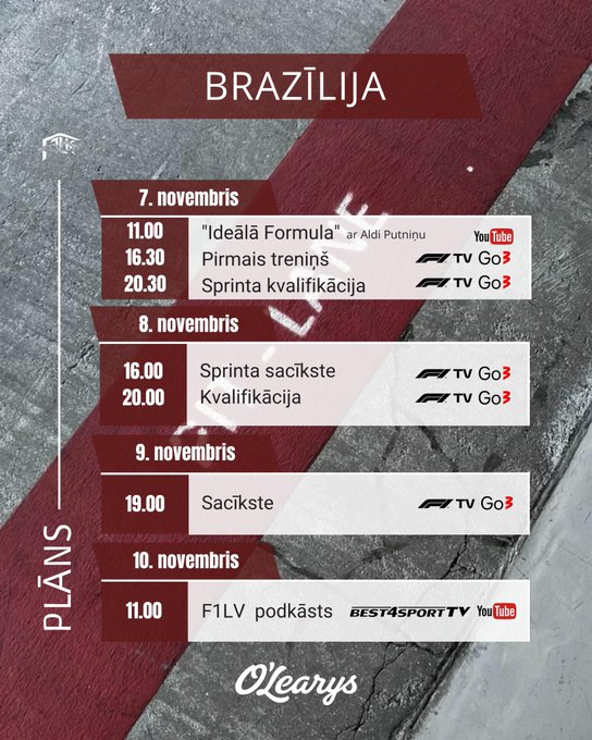 Grafiks: Šīs sezonas priekšpēdējā iespēja redzēt sprintu. Arī uz šo Latiņamerikas posmu F1 atbalsta klases nav devušās, tādēļ visa uzmanība lielajām zvaigznēm. Posms risinās pa dienu pēc vietējā laika, līdz ar to mums sestdien sprints pl. 16:00, kvalifikācija pl. 20:00, bet sacīkstes svētdien stundu agrāk – pl. 19:00.