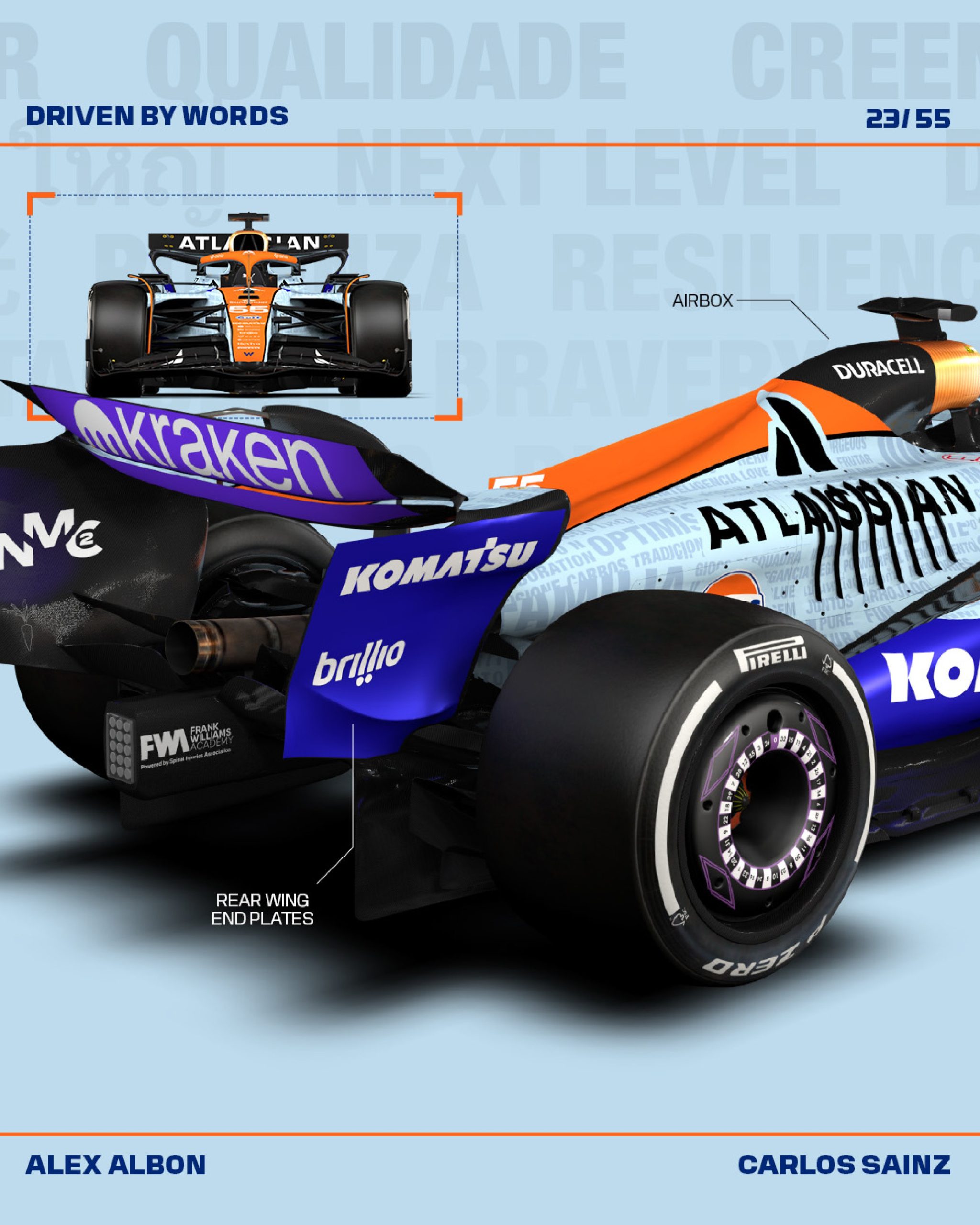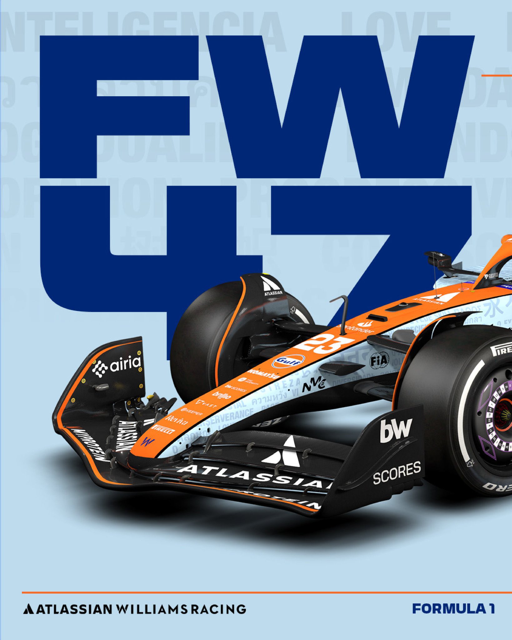 Šoreiz krāsojumam piešķirts īpašs akcents – uz automobiļa virsbūves būs redzami 493 vārdi un frāzes, ko fani visvairāk saista ar “Williams” un “Gulf”. Tie izvēlēti aptaujā, balstoties uz vairāk nekā 140 000 balsu, un iekļauti dizainā, kas kombinē oranžo un gaiši zilo krāsu.