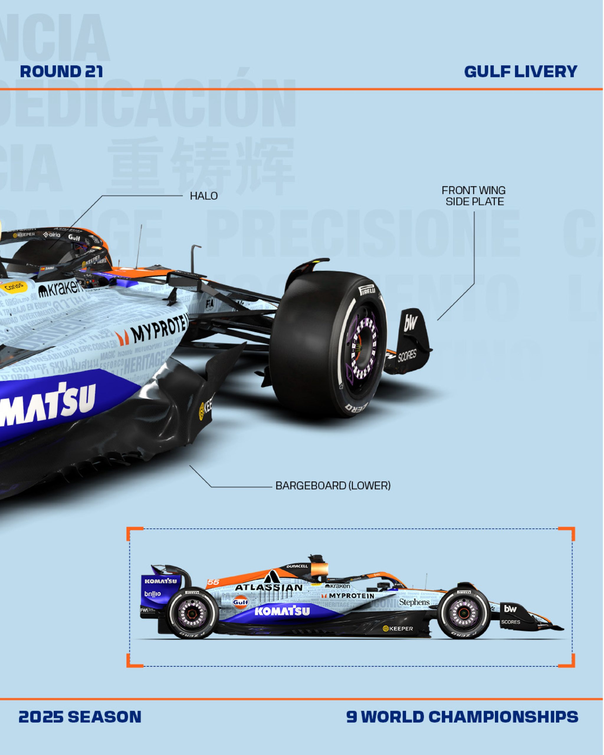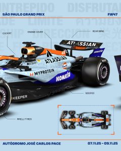 Pirmo reizi britu komanda “Gulf” dizainu izmantoja 2023. gadā trīs posmos, atzīmējot sadarbības pirmo sezonu ar leģendāro eļļas zīmolu. Tagad ikoniskā oranži–zilā krāsu gamma atgriežas Interlagosas trasē, kur “Williams” cer pārtraukt divu sacīkšu sēriju bez punktiem.