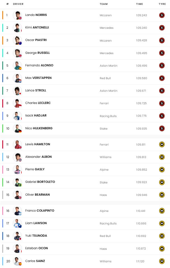 Noriss pēdējo apli veica vēl mazliet ātrāk kā iepriekš un ar rezultātu 1:09.243 izcīnīja pirmo starta vietu. Antonelli atpalika 0.097 sekundes un nodrošināja sev otro starta pozīciju uz sprintu, savukārt Piastri pārspēja Raselu cīņā par trešo vietu. Piektajā vietā kvalificējies Alonso, bet Makss Verstapens, neskatoties uz rekordu pirmajā trases sektorā, beigās palika sestais. Lenss Strols tika līdz septītajai vietai, aiz sevis atstājot Leklēru, Īzaku Hadžāru un Niko Hilkenbergu.