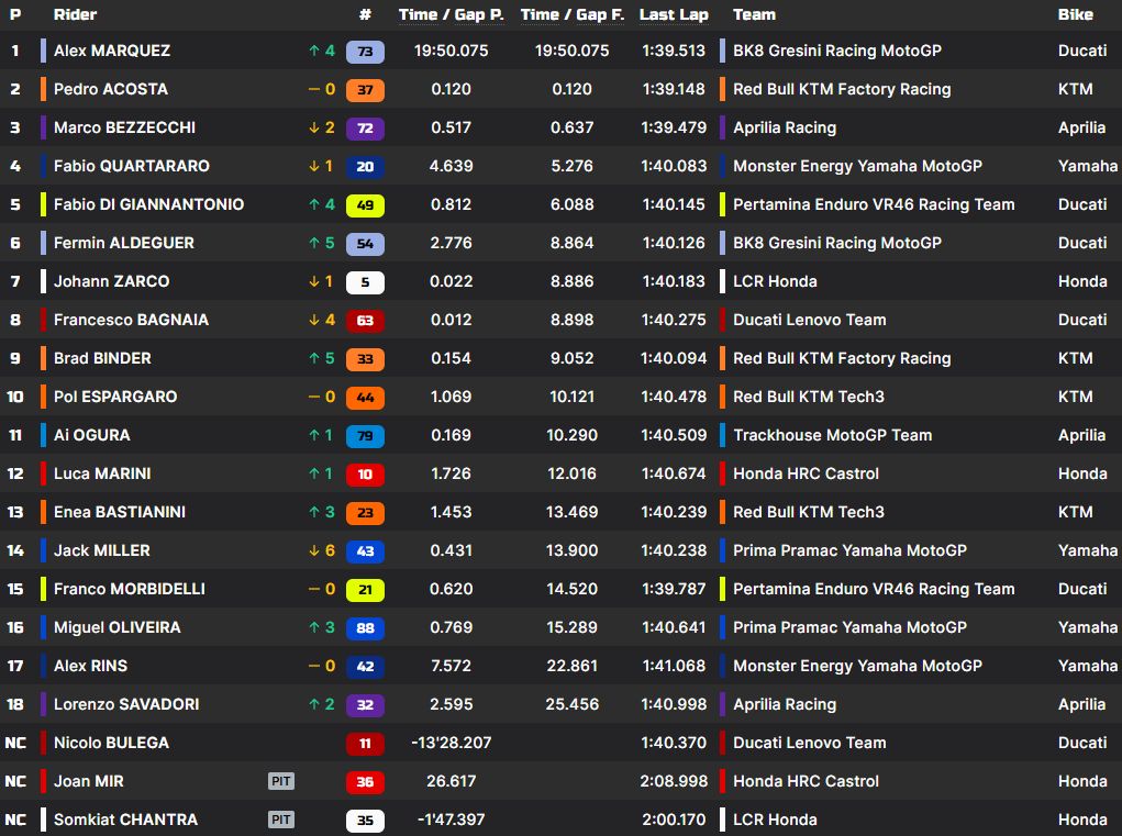 Akosta finišēja otrais, kamēr Bedzeki nodrošināja “Aprilia” trešo vietu. Ceturtais bija Fabio Kvartararo ar “Yamaha”, bet piektais – Fabio di Džannantonio no “VR46 Ducati” vienības. Fermins Aldeguers un Johans Zarko taisnē apdzina Frančesko Bagnaiju, kurš beigās palika vien astotais.