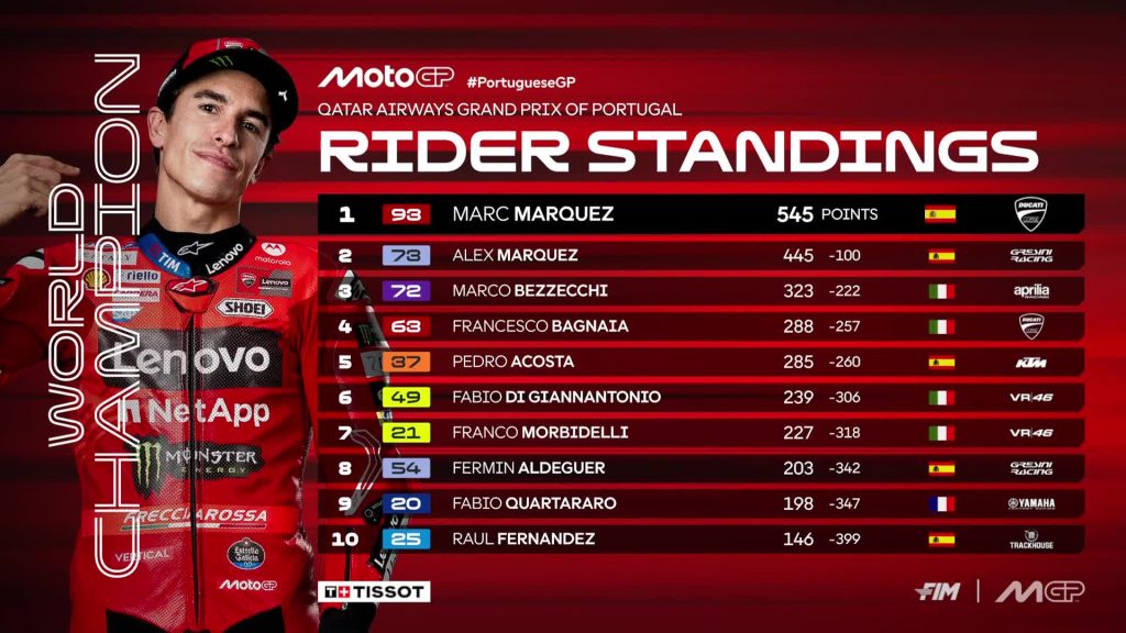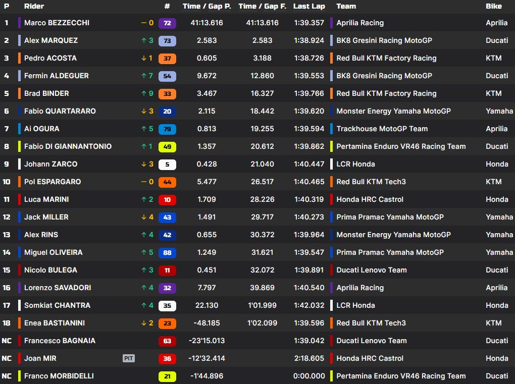 Bagnaija, kuram sacensību sākumā izdevās apsteigt Fabio Kvartararo, kļūdījās un izstājās, līdz ar to viņš tagad atpaliek no Bedzeki par 35 punktiem, bet sezonā palicis tikai viens posms. Fermins Aldeguers izmantoja situāciju un pēc agresīva manevra piektajā līkumā izcīnīja ceturto vietu, aiz sevis atstājot Kvartararo un Bredu Binderu.