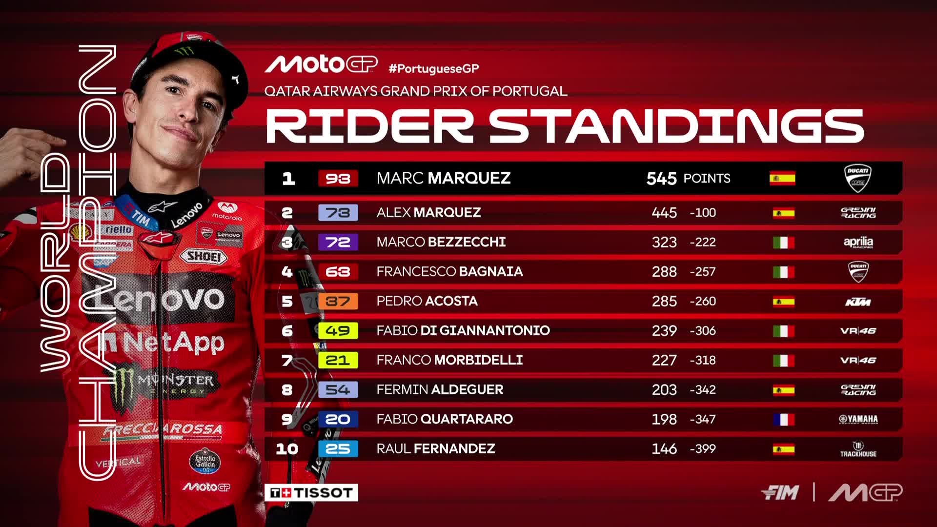 Bagnaija, kuram sacensību sākumā izdevās apsteigt Fabio Kvartararo, kļūdījās un izstājās, līdz ar to viņš tagad atpaliek no Bedzeki par 35 punktiem, bet sezonā palicis tikai viens posms. Fermins Aldeguers izmantoja situāciju un pēc agresīva manevra piektajā līkumā izcīnīja ceturto vietu, aiz sevis atstājot Kvartararo un Bredu Binderu.