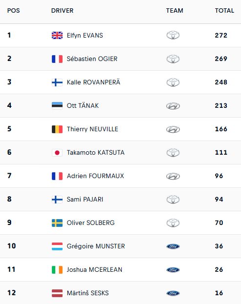 Čempions tiks noskaidrots novembra beigās, kad Saūda Arābijā norisināsies pasaules čempionāta noslēdzošais posms. Pirms izšķirošajām sacensībām Evanss saglabā līderpozīciju, bet vairs tikai ar trīs punktu pārsvaru pār Ožjē, kamēr Rovanperam jau 24 punktu deficīts. Ar “Rally1” mašīnu Saūda Arābijas rallijā startēs arī latvieši Mārtiņš Sesks un Renārs Francis.