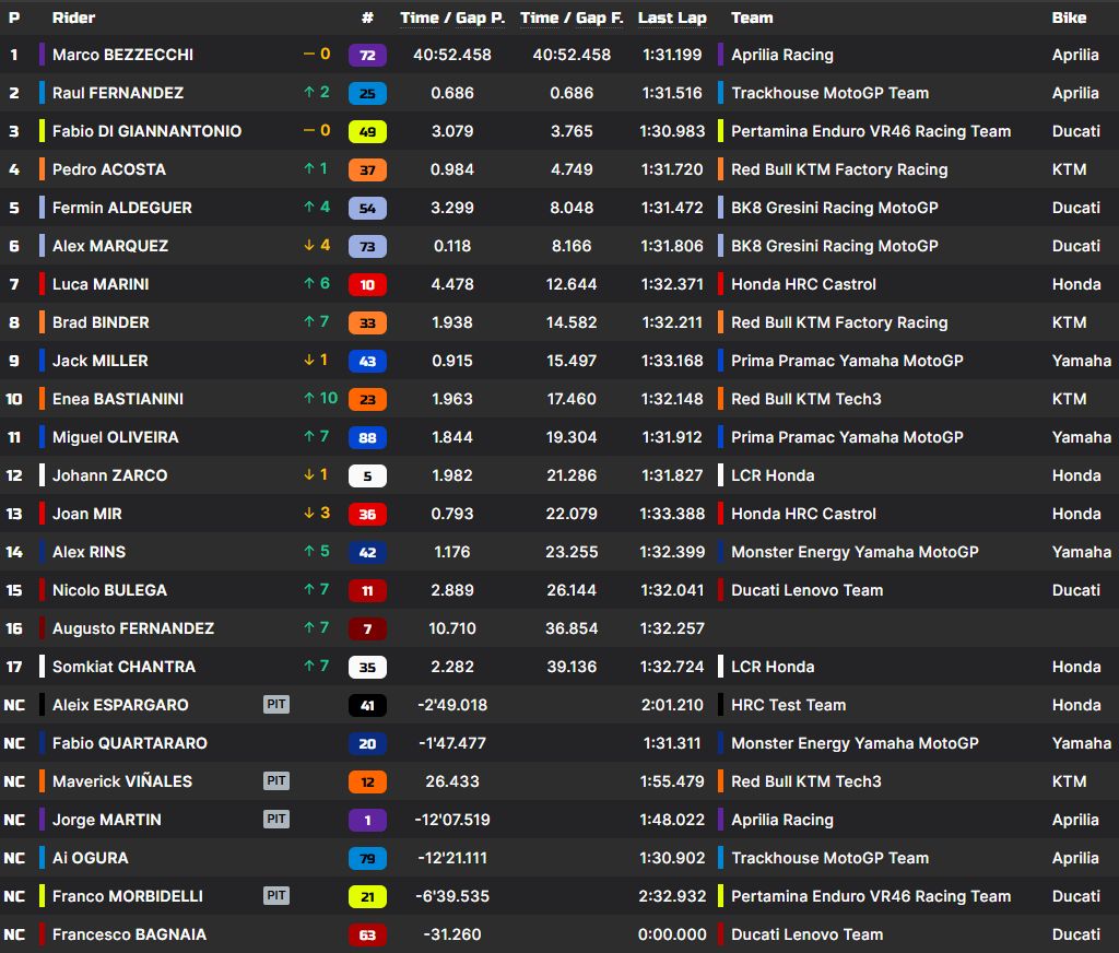 “Aprilia” rūpnīcas komandas braucējs Bedzeki noturēja aiz sevis “Trackhouse Aprilia” pārstāvi Raulu Fernandesu un tika pie otrās uzvaras pēc kārtas, kā arī trešās šajā sezonā. “VR46” vienības sportists Fabio di Džanantonio izcīnīja trešo vietu, saglabājot “Ducati” pjedestālu sēriju.