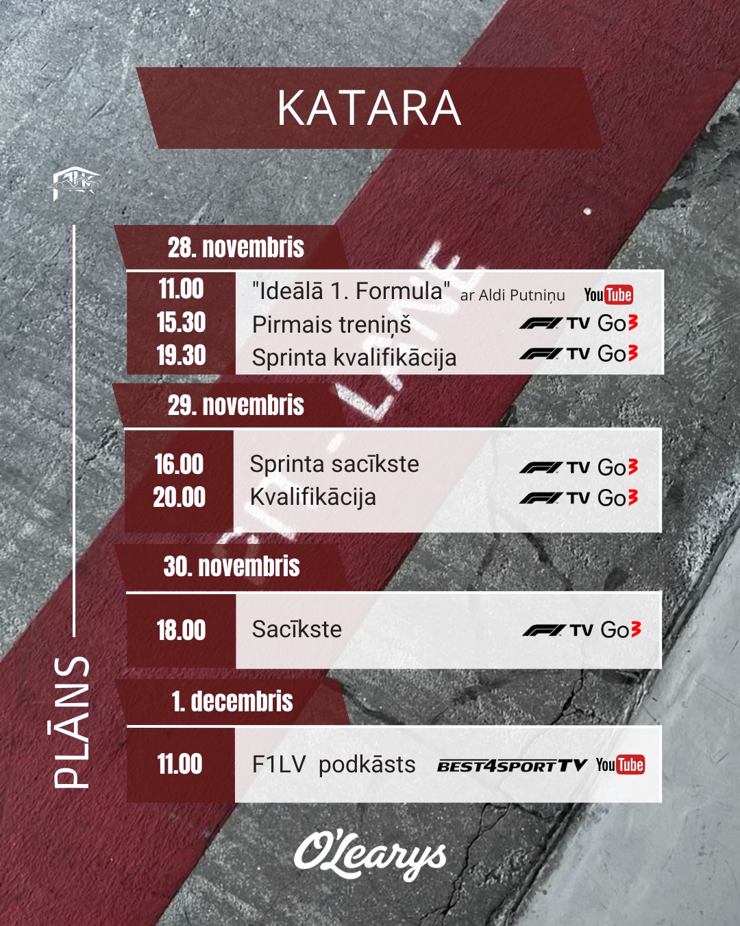 Grafiks: Cīņas pie mākslīgā apgaismojuma nozīmē, ka galveni notikumi gaidāmi vakarā pēc saulrieta. Sprints sestdien pl. 16:00, kvalifikācija četras stundas vēlāk, bet svētdien sacīkšu starts pl. 18:00 pēc Latvijas laika. Uz Lūsailas trasi devušies arī Formula 2 braucēji.