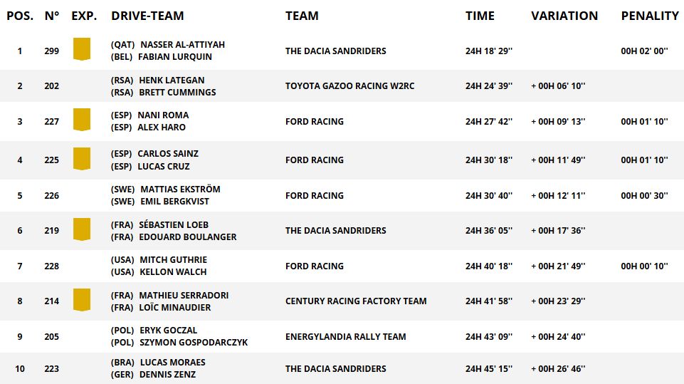 Al-Atija posma vadību pārņēma aptuveni trešdaļā distances, apsteidzot Žuanu Fereiru, un, neraugoties uz spiedienu no Seta Kintero un vēlāk arī Lēba, spēja noturēt līderpozīciju līdz finišam. Veiksmīgais sniegums, apvienojumā ar Henka Lategana problēmām “Toyota” sastāvā, ļāva Kataras braucējam atgūt kopvērtējuma pirmo vietu. Pēc sestā posma viņš ir 6 minūtes un 10 sekundes priekšā Lateganam.