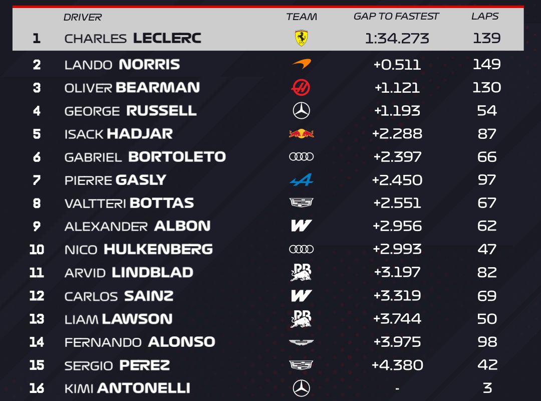 Džordžs Rasels, kurš pārņēma stūri no Antonelli, uzrādīja ceturto ātrāko laiku, savukārt Hadžārs spēja pacelties līdz piektajai pozīcijai, lai gan no līdera Leklēra atpalika vairāk nekā divas sekundes. Jāņem vērā, ka testos komandas strādā ar dažādiem riepu sastāviem un degvielas daudzumiem, tāpēc tīrs apļa laiks šobrīd nav galvenais rādītājs.